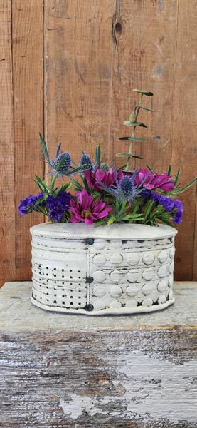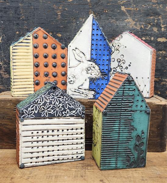 I started working in clay over 25 years ago and I haven't looked back. I create functional and sculptural, hand-built works using slab construction with red clay that are fired in an electric kiln. I am inspired by a revolving list of things, but I am most consistently interested in old or vintage items including buildings, dishes, containers, tinware, bottles and especially aged and worn surfaces